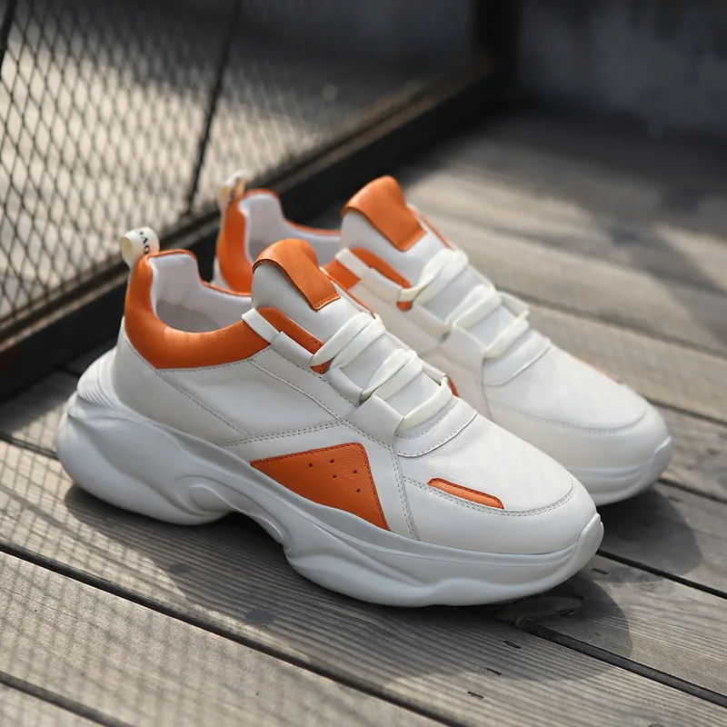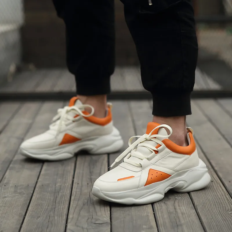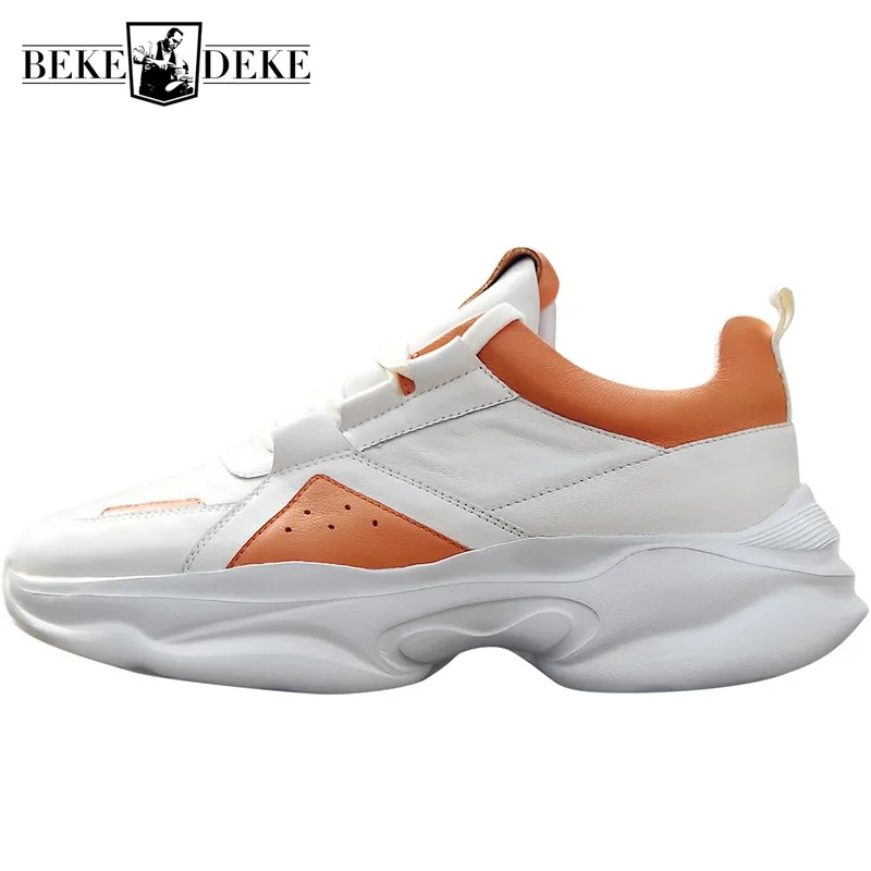 Genuine Leather Chunky Platform Lace Up Sneakers Men Summer Jogging Breathable Shoes Height Increas
